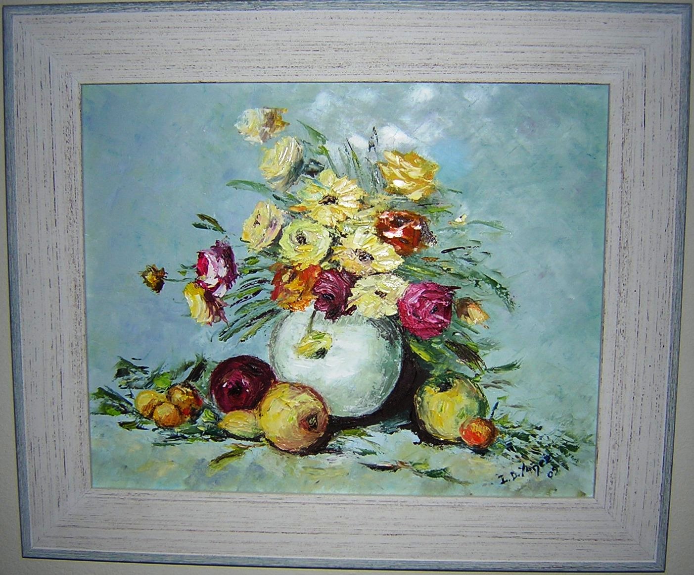 Título: Flores y manzanas Bastidor 6F (41 x 31) , enmarcado en madera azulado Óleo con espátula Precio: 450€ Ref: FN5 |