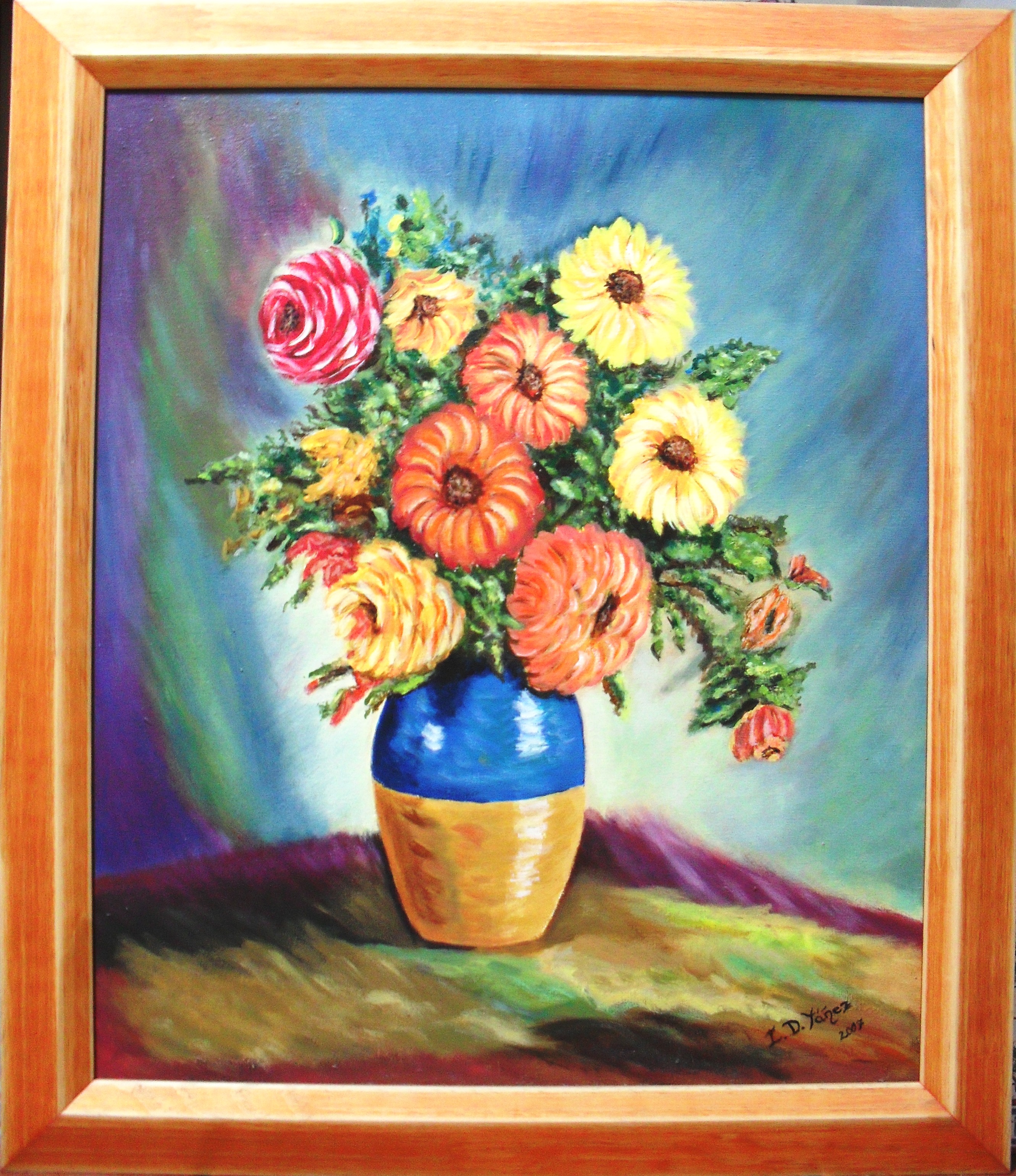 Título: Hortensia en jarrón Original Lámina de 62 x 43, enmarcada en madera, con cristal opaco Óleo-pincel Precio: 250€ Ref: FN9 |