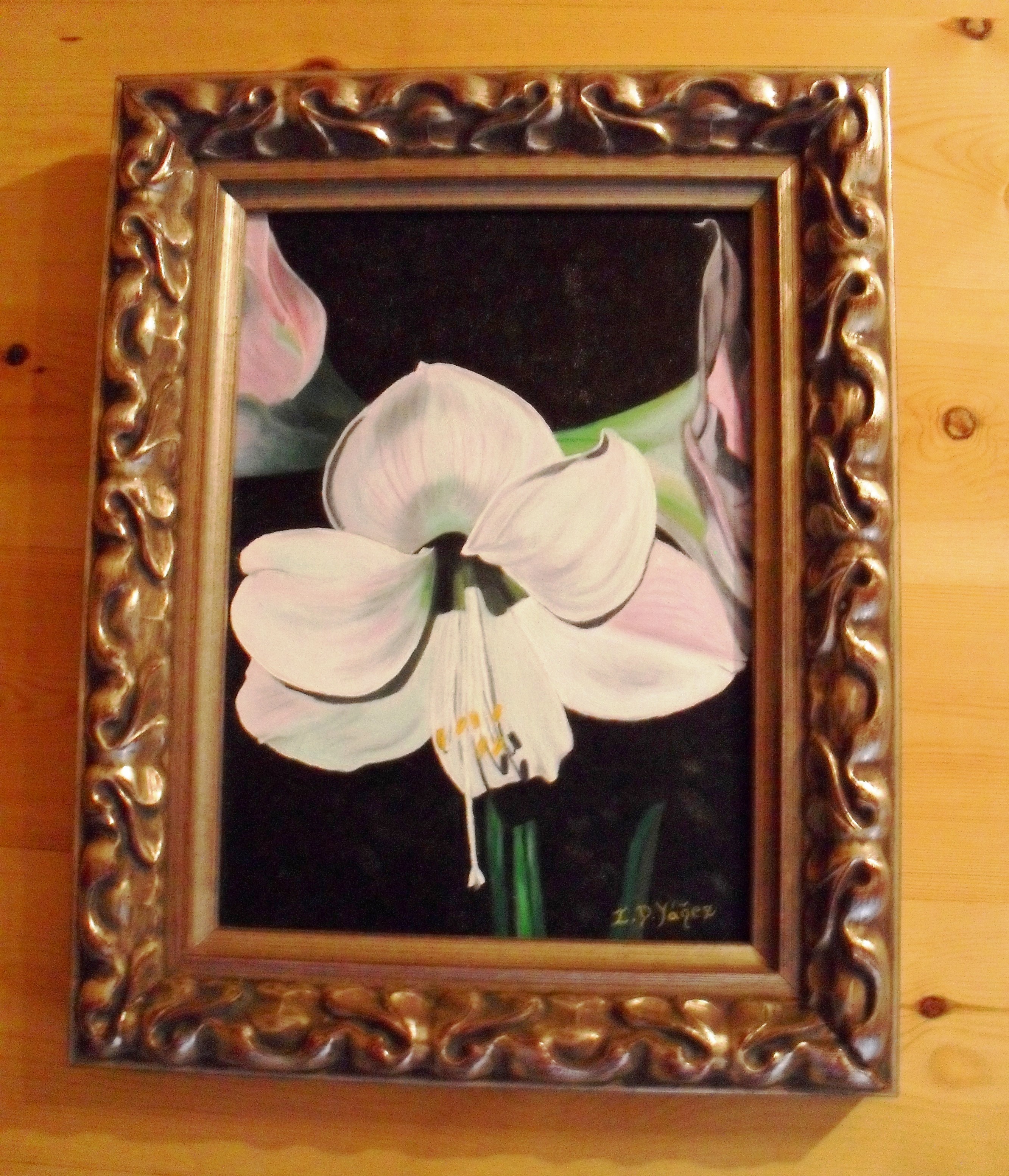 Título: Lirio Blanco Original Tablilla entelada 4F (33 x 24), enmarcado en madera, dorado óleo-pincel Precio: 175€ Ref: FN3 |