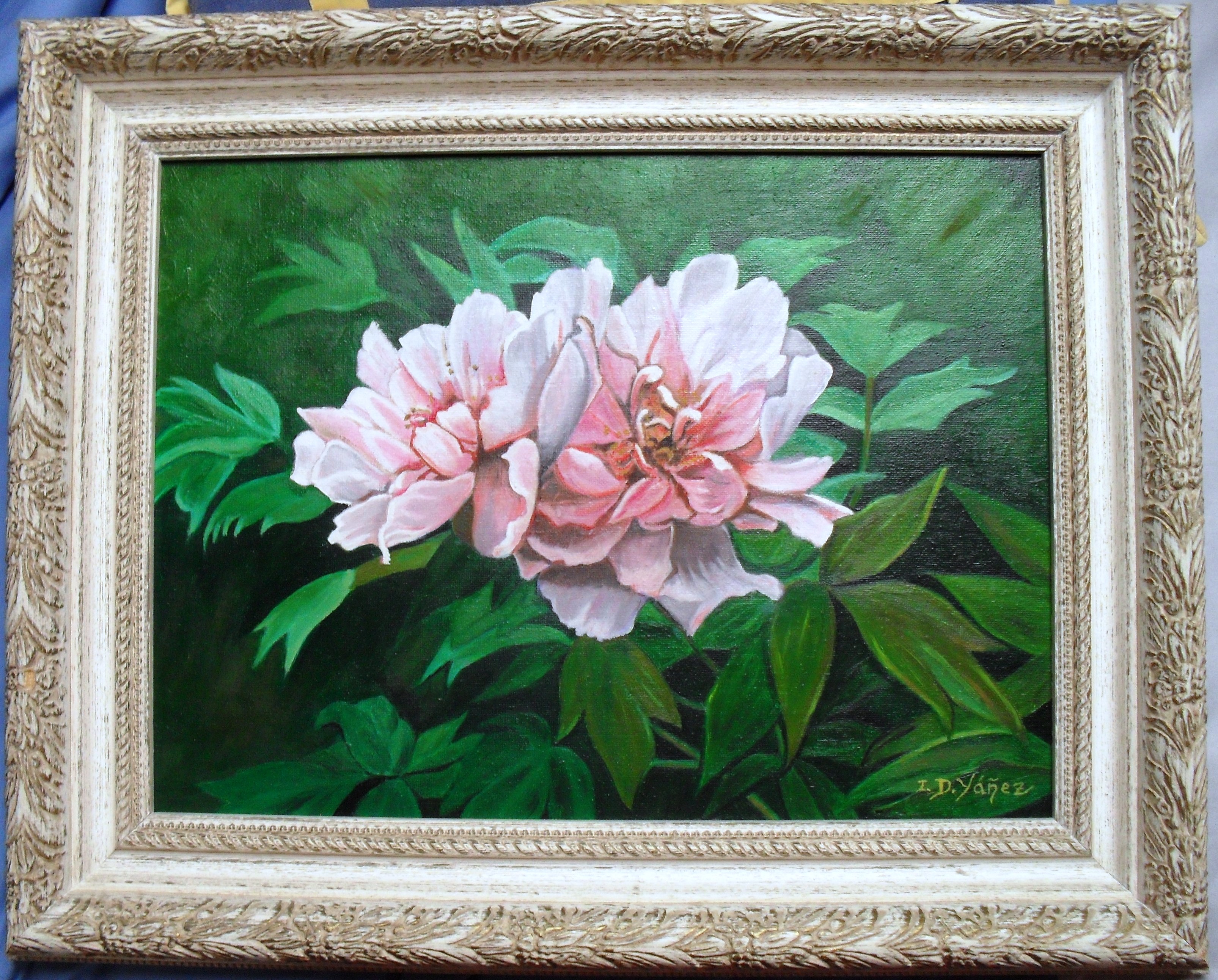 Peonía rosa Copia Tablilla 41 x 31 , enmarcado en madera labrada con blanco Óleo-pincel Precio: 450€ Ref: FN6 |